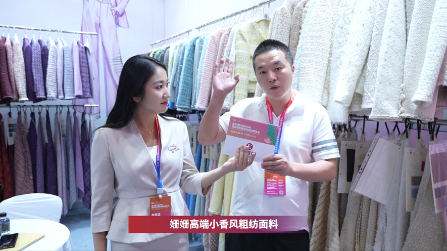 我们是小香风的源头工厂,织造染一体。来参加本次展会,我们带来了很多特色展品。为了呈现出更好的形态,我们的每一款面料都配上了成衣。比如我们的染色系列,有多种颜色组合在里面。我们的设计理念是想要将更好的原创产品给予广大的客户,我们将会更多开发自己的原创产品,进行面料行业的创新。我们目前的合作主要面向江浙沪、广州、深圳等地客户,也欢迎对中高端、质感有需求的客户来联系我们。本次展会环境布置很好,人流量多,大家的精神面貌也可以。